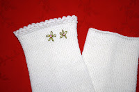 Nu är den första pulsvärmaren klar. Jag har använt ett restgarn som jag hade hemma, Ingelise Strumpgarn. Pulsvärmaren blev ganska tunn, men värmer bra ändå. Jag stickade slätstickning först och avslutade med en virkad kant både upp- och nertill. Så broderade jag dit en liten blomma med en pärla i mitten. För att vara ett första försök är jag ganska nöjd. Nu återstår bara att färdigställa pulsvärmare nummer två.