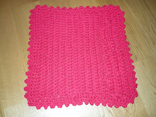 Men numera går det faktiskt att köpa trikåtrasor som redan är klippta som remsor! Så i höstas när jag var på Syfestivalen i Kistamässan slog jag till på julrött trikågarn och har precis avslutat denna matta, som numera får bo i mitt badrum!
