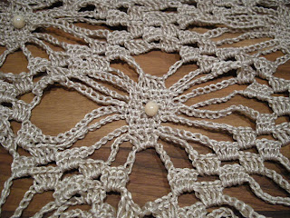 Nu har jag äntligen lyckats slutföra mitt sjalprojekt. Livskvalitét är att gå upp ur sängen och slå på tv:n och sedan krypa ner igen med virkning… Detta gjorde jag i söndags morse. För att piffa till sjalen lite extra sydde jag i efterhand fast pärlor med genomskinlig tråd (sådan som man normalt använder när man qviltar lapptäcken). Det går att virka in pärlor också, det kommer jag att pröva nästa gång! Pärlorna har jag tagit från ett gammalt halsband som gått sönder, pärlor är alltid bra att spara, de kan liva upp mycket! Garnet är som jag tidigare berättat Drops Cotton Viscose, även mönstret kommer från Garnstudio, jag har dock valt att halvera storleken. För min användning tycker jag att denna storlek räcker, det gick åt fyra nystan.