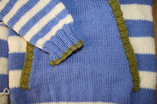 Mitt bland alla andra projekt, så har jag också påbörjat en tröja till sonen. Den blir med raglanärm, stor ficka på magen och med huva. ”Randig Hoodtröja” kallas den. Mönstret hittade jag i tidningen Allt om handarbetes stickmagasin, nr 2 2010. Jag har fel garn och andra färger, men jag tror ändå den kan bli ganska snygg till jeansen i vår/sommar. Jag har redan hunnit göra både fram och bakstycke och snart hälften av ärmarna, så det går framåt. Ska jobba på att försöka bli klar med denna under veckan.