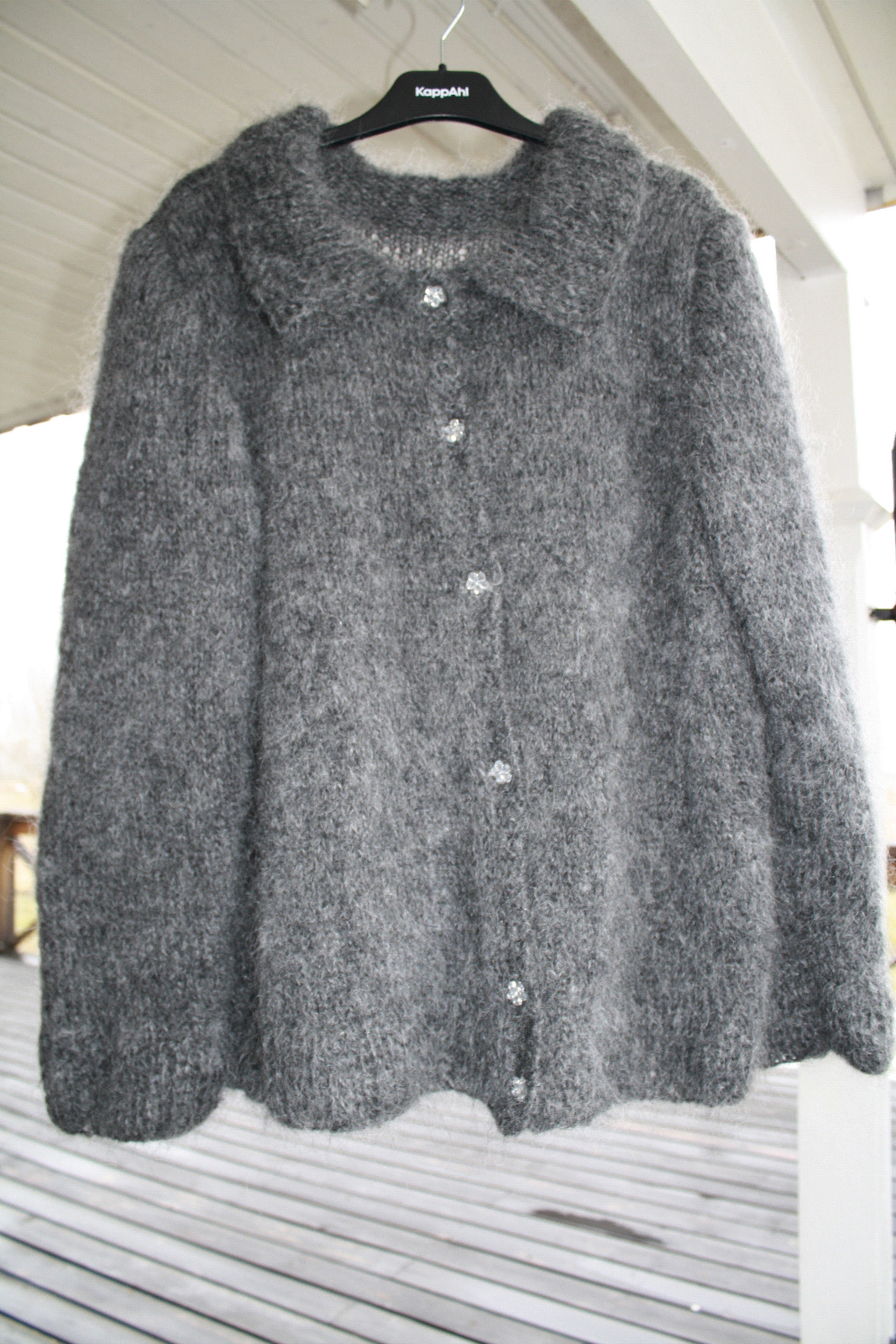 Äntligen är min mohairkofta färdig. Jag köpte garnet och stickade allt färdigt tills det var dags att börja montera den, men då blev den liggande. Jag vet inte hur länge den har legat, men säkert ett år snart i alla fall. Man kanske skulle kunna säga att den fick mogna till sig lite. Nu har jag i alla fall gjort den färdig. Garnet heter Malin och färgen är antracitgrå. Modellen är av mer kavajtyp än kofta och även om det känns som om detta mer är ett plagg för kalla vinterdagar, så vet man ju med säkerhet att fler vintrar kommer och denna grådaskiga dag känns det som om den skulle kunna fungera ganska bra också. Jag gick ut för att fota den och för att få lite dagsljus, för det kändes så mörkt inomhus, men så dimmigt och disigt som det är idag, så är det inte mycket dagsljus att hurra för.