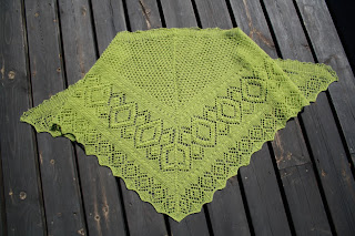 Nu har jag blockat min sjal. Jag blockade på en gammal madrass. Det är inte lätt att komma på vad man ska använda när man har ett ganska stort alster som ska blockas. Den blev otroligt skir och fin. Jag har testat att vira den lite tätare runt halsen och det ser ut att bli hur bra som helst. Så våren nu kommer jag, rustad för kalla vindar och frostiga inledningar på dagen.