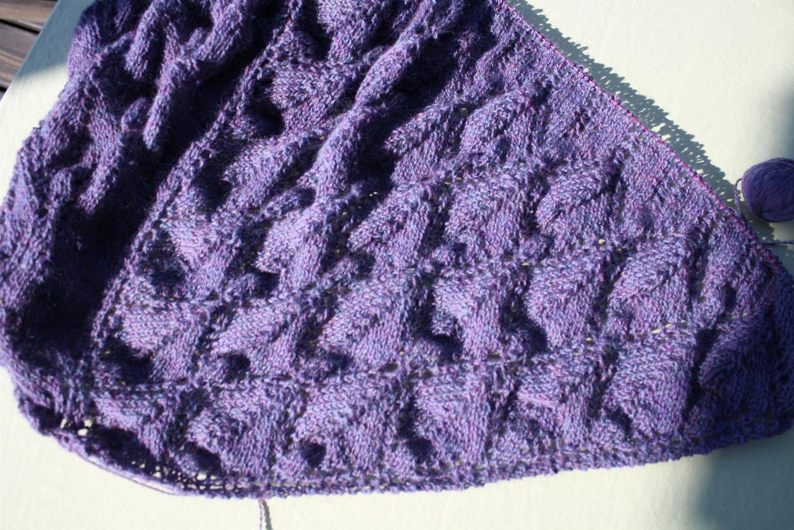 Det går framåt om än lite långsamt kanske. Just nu har jag hunnit så pass långt på sjalen att det börjar bli många maskor på stickorna och då ser det inte ut som om det skulle hända särskilt mycket även om man tycker att man stickar på som en galning. Hur som helst är nu sjalen drygt 50 cm från nacken ner till kanten och nu har jag gått in i en ny del av mönstret. Det tog en stund att fundera ut hur de hade tänkt sig, men oavsett om jag gör rätt eller inte just nu, så tycker jag att min lösning blir ganska bra.