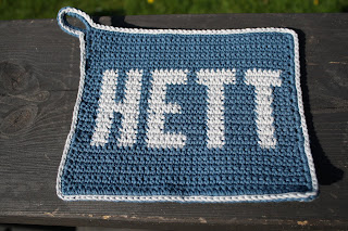 I väntan på att garnet jag beställt till disktrasorna ska komma hem, så har jag påbörjat ett par grytlappsprojekt. Detta är mitt första försök på detta sätt. Jag har virkat ett antal grytlappar i mina dagar, men jag har aldrig provat att virka en text tidigare. Det är lite klurigt när man virkar och byter färg eftersom maskorna inte ligger direkt över varandra som när man stickar, så det blir inte så distinkta gränser mellan en färg och en annan, men jag tycker ändå att den blev ganska bra. Kanske lägger jag ut den på Signerat för försäljning. Jag ska fundera på det.