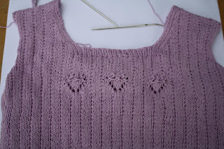 Jag har jobbat på ganska flitigt de senaste dagarna med bomullströjan jag håller på att sticka. Vet inte om jag tycker att den blir så fin. Jag använder visserligen ett väldigt billigt garn, men jag tycker att den blir så ojämn i strukturen även om grundmodellen är fin. Hittills har jag hunnit göra framstycket klart och så håller jag på med bakstycket. Till ärmhålet stickade jag bak- och framstycke samtidigt på en rundsticka, men sedan stickas de en i taget. Garnet jag använder är ett bomullsgarn som heter Cotton 8 och färgen är syrénlila. Ni får ursäkta bilden, för den är verkligen inte vacker och den gör inte heller tröjan rättvisa. Varken vad gäller färg eller form. Jag får lova bättring till nästa gång jag visar tröjan här på bloggen. Då ska den vara färdig med ärmar och blockad och fin.