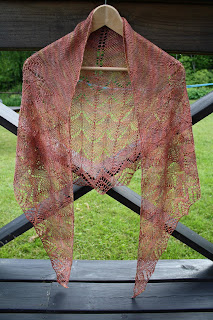 Inte hinner jag sticka klar någon vit bolero till midsommarafton inte. Det kom liksom en massa annat emellan. Dessutom saknade jag de stickor jag behövde till mönstret, så det bidde ingenting av med att sticka någon bolero. Nu kan det ju tänkas att jag kan bli ganska fin i alla fall, för nu har jag stickat färdig min sjal i silkesgarn, så lite fin blir jag nog till midsommar i alla fall. tror att jag har en klänning som denna blir pricken över i på. Sjalen är en travelling woman, men jag valde att göra fler varv av mönster A, eftersom jag ville ha den lite större. Nu tycker jag att storleken är prefekt.