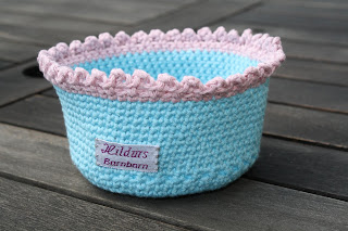 Här är ännu en korg. Denna blev lite mindre och jag valde att inte vika ner kanten, utan avslutade istället med ett varv picoter. Den blev ganska söt tycker jag. I en liten flickas rum kanske?