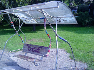 En ljuvlig sommardag för någon vecka sedan, så gick jag med familjen längs gångvägarna vid Årstaviken. Solen sken och det var en fantastisk dag. Längs med vägen hade de satt upp hammockar. Tyvärr var flera av dessa utsatta för sabotage av olika slag. Framför allt rörde det sig om klotter och söndersparkade tak. Tänk att det ska vara så nödvändigt att förstöra allt som gör livet lite trevligare! När vi nådde Tantolunden, så hittade jag denna hammock. Denna har utsatts för både vanligt traditionellt klotter, men så har någon även utsatt den för lite knit grafitti. Jag måste ju säga att jag föredrar det senare. Jag tycker inte det förfular utan tvärtom att det var ett ganska trevligt inslag. Eller vad säger ni?