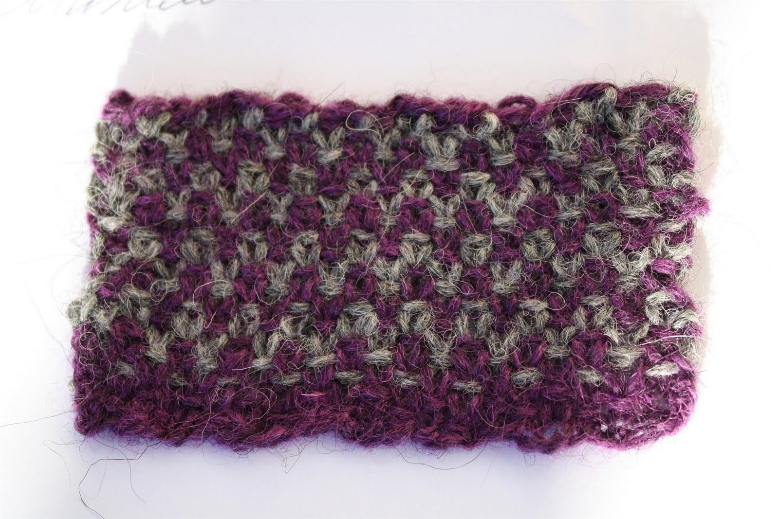 Detta är ett vävmönster. Ett väldigt ”tätt” mönster, så man får använda större stickor än man tror när man ser resultatet på provlappen. Jag ser en väska eller kanske ett par vantar gjorda i denna teknik. Mycket vackert tycker jag. Bilden ovan är stickad i två färger och bilden under med tre (tror det är lite svårt att se kanske) Detta är också en kombination av lyfta maskor, placering av garnet och räta och aviga maskor. Enkelt och ändå ser det så avancerat ut.